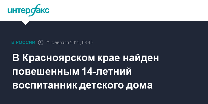 Краевое СУ СКР сообщает, что накануне в правоохранительные органы поступило сообщение об обнаружении в туалетной комнате детского дома N1 города Назарово тела 14-летнего воспитанника, висящего на шарфе, замотанном на перекладине туалетной кабинки.