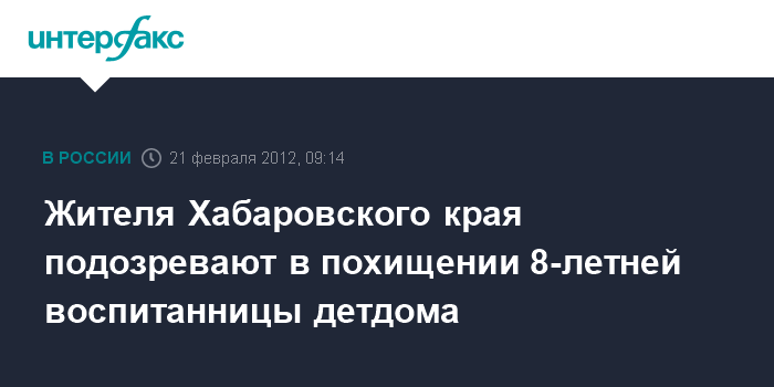 Хабаровск. 21 февраля. INTERFAX.RU - Уголовное дело по факту похищения из детдома 8-летней девочки возбуждено в Хабаровском крае, сообщает СУ СК РФ по региону во вторник.