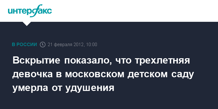 Москва. 21 февраля. INTERFAX.RU - Причиной гибели трехлетней девочки, скончавшейся от травмы, полученной на прогулке в детском саду на севере Москвы накануне, стало удушение, сообщил "Интерфаксу" источник в медицинских кругах столицы.