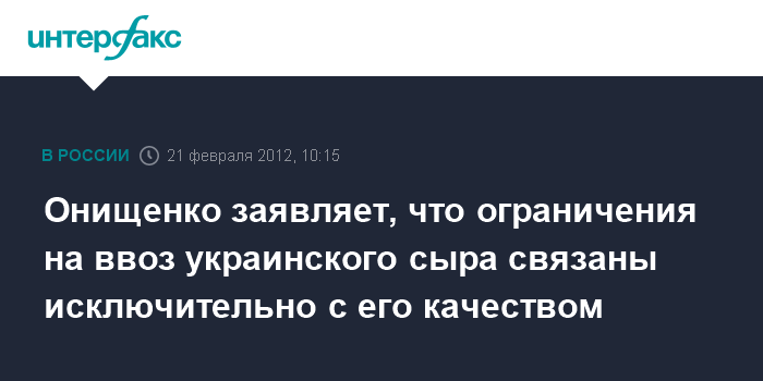 Москва. 21 февраля. INTERFAX.RU - Глава Роспотребнадзора Геннадий Онищенко заявил, что Россия готова возобновить завоз из Украины сыров, если они будут надлежащего качества.