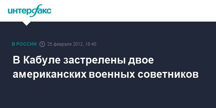 Лондон. 25 февраля. INTERFAX.RU - Двое американских военных советников убиты в субботу в ходе перестрелки у здания министерства внутренних дел Афганистана, сообщает британская телерадиокорпорация Би-би-си. Этот инцидент произошел на пятый день антиамериканских выступлений, захлестнувших разные районы Афганистана в связи с недавними событиями на американской военно-воздушной базе "Баграм" под Кабулом, где были сожжены священные мусульманские книги, в том числе и Кораны.