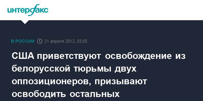 Вена. 21 апреля. ИНТЕРФАКС - Представитель США при ОБСЕ Иэн Келли назвал важным шагом освобождение из тюрьмы в Белоруссии оппозиционеров Андрея Санникова и Дмитрия Бондаренко.