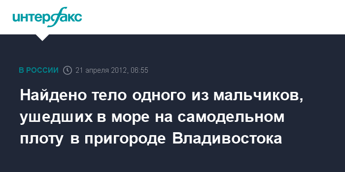 Владивосток. 21 апреля. ИНТЕРФАКС-ДАЛЬНИЙ ВОСТОК - Один из двух детей, ушедших накануне вечером на самодельном плоту в Амурский залив в пригороде Владивостока, найден мертвым.