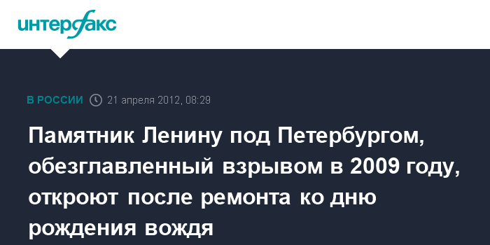 Санкт-Петербург. 21 апреля. ИНТЕРФАКС СЕВЕРО-ЗАПАД - Повторное открытие памятника Владимиру Ленину, обезглавленного неизвестными вандалами в 2009 году, пройдет на юго-западе Петербурга накануне дня рождения вождя мирового пролетариата.