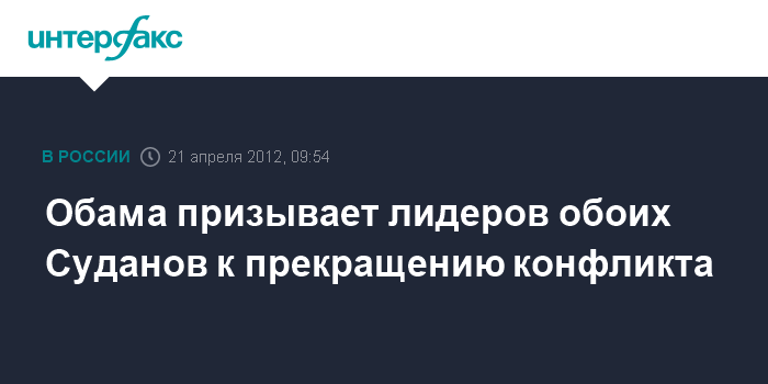 Вашингтон. 21 апреля. INTERFAX.RU - Президент США Барак Обама призвал руководство Судана и Южного Судана прекратить конфликт из-за спорного приграничного района Хеглиг. "Правительство Судана должно прекратить военные действия и, в частности, бомбардировки южносуданских территорий. Аналогичным образом правительство Южного Судана должно перестать поддерживать вооруженные группировки внутри Судана", - сказал Б.Обама в видеообращении, размещенном на портале YouTube.