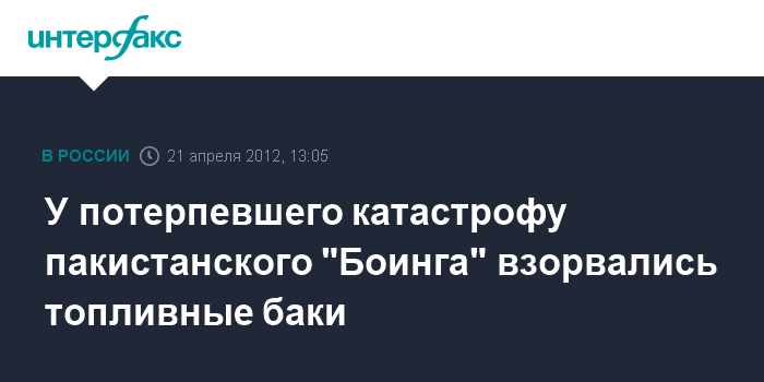 Исламабад. 21 апреля. INTERFAX.RU - По данным предварительного расследования, пакистанский самолет "Боинг-737" потерпел катастрофу после возгорания топливных баков и последовавшего за этим взрыва, сообщило Управление гражданской авиации Пакистана.