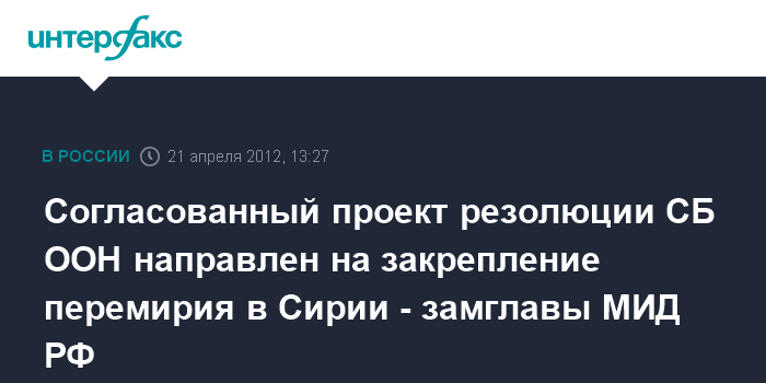 Москва. 21 апреля. INTERFAX.RU - Инициированная Россией резолюция ООН по отправке наблюдателей в Сирию позволит укрепить режим прекращения огня, считает замглавы МИД РФ Геннадий Гатилов. "Инициированная Россией резолюция СБ ООН о развертывании в Сирии масштабной миссии наблюдателей ООН сделает более устойчивым прекращение насилия", - написал он в своем аккаунте в Твиттере в субботу.