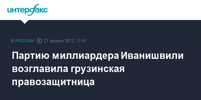 Тбилиси. 21 апреля. INTERFAX.RU - Грузинский миллиардер Бидзина Иванишвили в субботу в Тбилиси основал новую партию - "Грузинская мечта - демократическая Грузия". Поскольку сам Б.Иванишвили, лишенный грузинского гражданства не может возглавлять партию, ее председателем учредительный съезд избрал правозащитницу и адвоката Манану Кобахидзе.