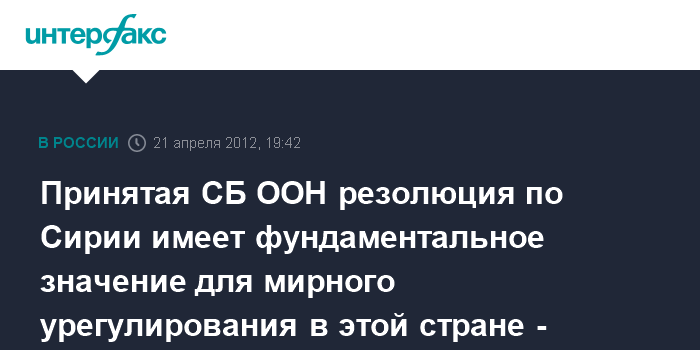 Нью-Йорк (ООН). 21 апреля. ИНТЕРФАКС - Принятая СБ ООН резолюция приобретает фундаментальное значение для продвижение процесса мирного урегулирования в Сирии, заявил, выступая на заседании Совета Безопасности, постпред РФ Виталий Чуркин.