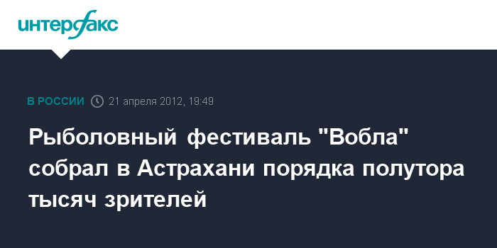 Астрахань. 21 апреля. ИНТЕРФАКС-ЮГ - Астраханский рыболовный фестиваль "Вобла" в субботу собрал 350 участников и около 1,5 тыс. зрителей, сообщил агентству "Интерфакс-Юг" организатор фестиваля Игорь Беляков.