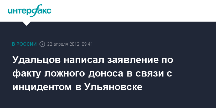 Москва. 22 апреля. INTERFAX.RU - Оппозиционер Сергей Удальцов расценил как ложный донос заявление ульяновской студентки Анны Поздняковой о том, что он ударил ее. "Сергей Удальцов написал заявление по факту ложного доноса гр-ки А.Поздняковой (ст. 306 УК РФ). Заявление зарегистрировано в УМВД Ульяновска", - говорится в записи в Твиттере оппозиционера.
