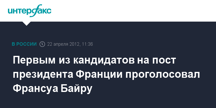 Париж. 22 апреля. INTERFAX.RU - Первым из кандидатов на пост президента Франции проголосовал в воскресенье лидер "Демократического движения" ("Модем") Франсуа Байру. Центрист Ф.Байру отдал свой голос в городе По (главный город исторической области Беарн и французского департамента Пиренеи Атлантические) вскоре после открытия избирательных участков на территории Франции.