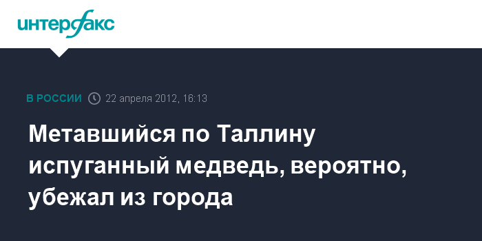 Таллин. 22 апреля. INTERFAX.RU - В столице Эстонии в воскресенье были прекращены поиски медведя, который бродил утром по улицам жилого района Пирита возле Певческого поля и направлялся в сторону жилого массива Ласнямяэ. В спасательном департаменте сообщили "Интерфаксу", что активные поиски животного прекращены около половины третьего, так как оно, скорее всего, покинуло город. В то же время спасатели призывают жителей города не терять бдительности, поскольку медведь может вновь объявиться.