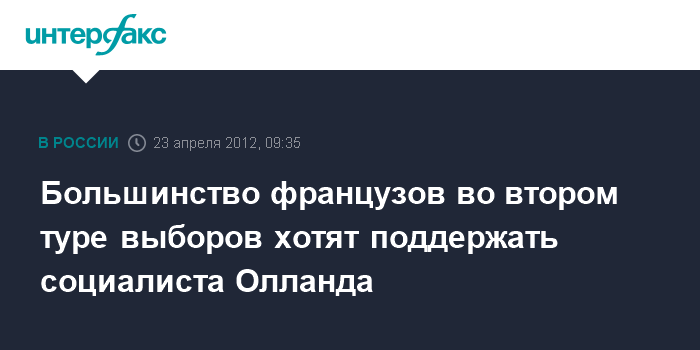 Париж. 23 апреля. INTERFAX.RU - Опубликованные после первого тура выборов президента Франции опросы показывают, что большинство французов во втором туре намерены отдать голоса кандидату от социалистов Франсуа Олланду.