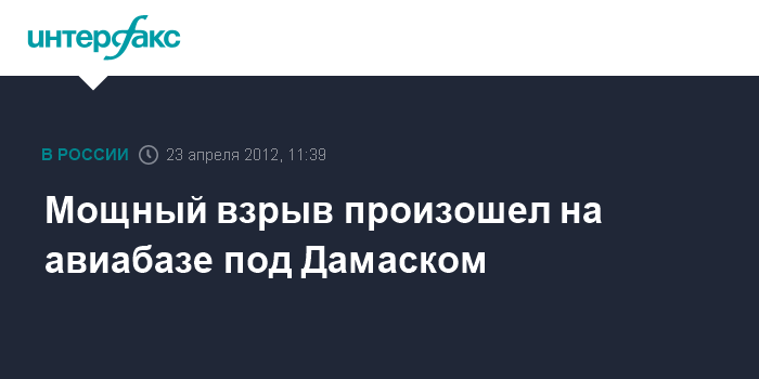Лондон. 23 апреля. INTERFAX.RU - Мощный взрыв произошел в субботу на сирийской авиабазе под Дамаском, сообщил базирующийся в Великобритании Наблюдательный совет по правам человека в Сирии.