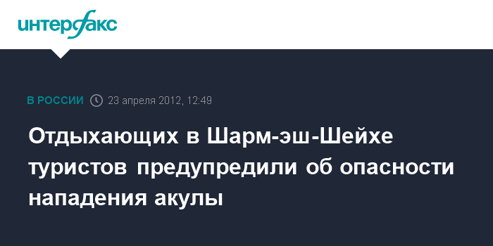 Каир. 23 апреля. INTERFAX.RU - Министерство по охране окружающей среды Египта в воскресенье выступило с предупреждением о возможной опасности нападения акулы на курорте Шарм-эш-Шейх, сообщают египетские СМИ.