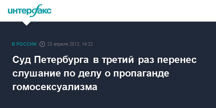 Санкт-Петербург. 23 апреля. INTERFAX.RU - Мировой суд Центрального района Петербурга в очередной раз отложил рассмотрение дела двух гей-активистов, задержанных во время пикета 7 апреля в БКЗ "Октябрьский", передал корреспондент "Интерфакса".