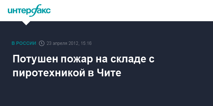 Чита. 23 апреля. INTERFAX.RU - Пожарные в Чите ликвидировали пожар на складе пиротехники, расположенном на окраине города, сообщили в понедельник агентству "Интерфакс-Сибирь" в пресс-службе краевого ГУ МЧС.