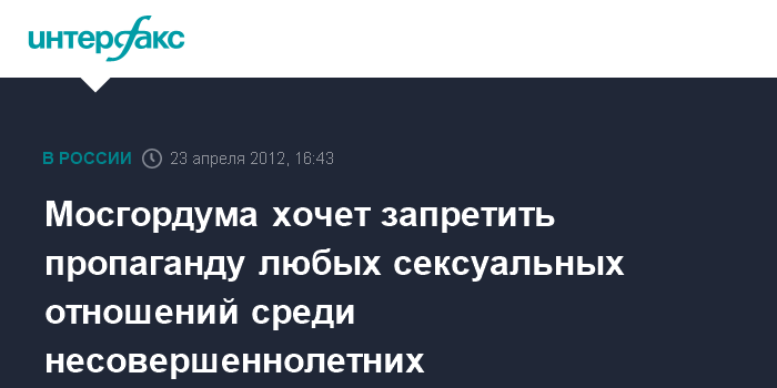 Москва. 23 апреля. INTERFAX.RU - Депутаты Мосгордумы собираются разработать городской закон, запрещающий пропаганду сексуальных отношений среди несовершеннолетних.