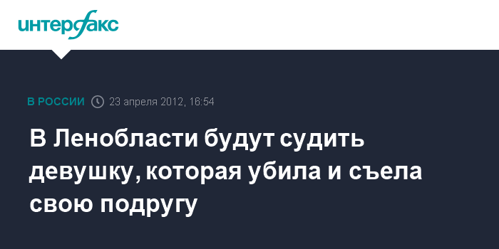 Санкт-Петербург. 23 апреля. INTERFAX.RU - В суд направлено уголовное дело в отношении невменяемой жительницы Ленинградской области, которая утопила подругу и съела часть ее ноги.