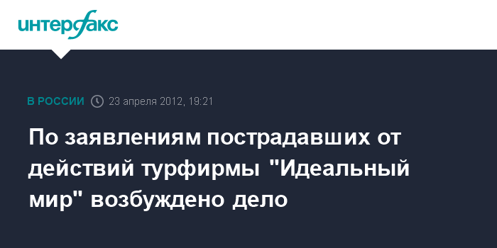 Москва. 23 апреля. INTERFAX.RU - Главное следственное управление (ГСУ) ГУ МВД РФ по Москве возбудило уголовное дело по заявлениям граждан, пострадавших от действий турфирмы "Идеальный мир", сообщили "Интерфаксу" в понедельник в пресс-службе столичного главка.