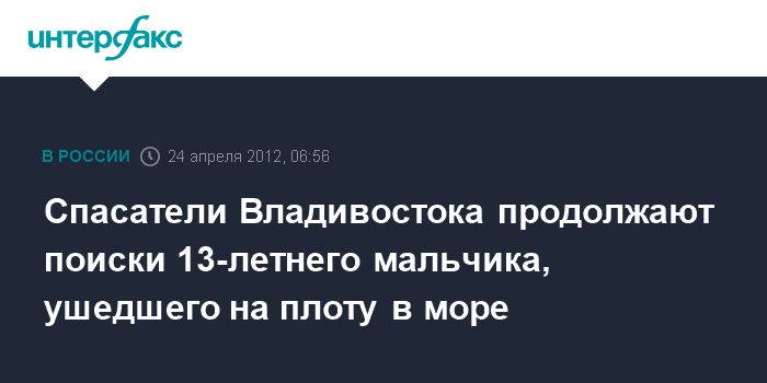 Владивосток. 24 апреля. ИНТЕРФАКС - ДАЛЬНИЙ ВОСТОК - В пригороде Владивостока спасатели четвертый день ищут 13-летнего мальчика, который пропал вместе со своим 11-летним приятелем - 20 апреля дети вышли в море на самодельном плоту из пластиковых бутылок.