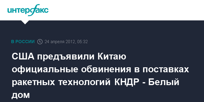 Вашингтон. 24 апреля. ИНТЕРФАКС - Соединенные Штаты официально обвинили Китай в том, что он поставляет Северной Корее технологии, связанные с ракетной техникой, заявил на брифинге пресс-секретарь Белого дома Джей Карни.