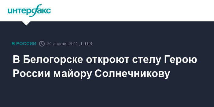 Хабаровск. 24 апреля. INTERFAX.RU - Торжественная церемония открытия стелы Герою России майору Сергею Солнечникову состоится 24 апреля в Белогорске (Амурская область), сообщил "Интерфаксу-АВН" начальник пресс-службы Восточного военного округа подполковник Александр Гордеев.