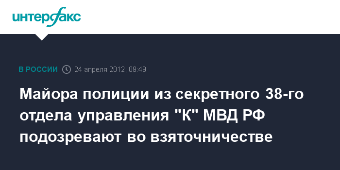 Москва. 24 апреля. INTERFAX.RU - Сотрудник одного из самых секретных полицейских подразделений - 38-го отдела управления "К" МВД РФ - подозревается в получении взятки, сообщил "Интерфаксу" источник в правоохранительных органах.