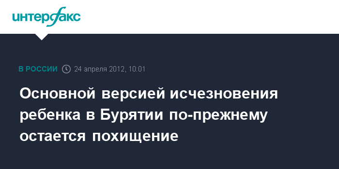 Чита. 24 апреля. INTERFAX.RU - Следственное управление СКР по Республике Бурятия проверяет восемь версий исчезновения шестилетнего Доржо Шойдорова в Улан-Удэ, сообщает пресс-служба республиканского ведомства во вторник.