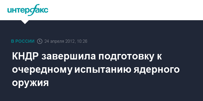 Пекин/Сеул. 24 апреля. INTERFAX.RU - КНДР практически завершила подготовку к очередному испытанию ядерного оружия, передают во вторник западные СМИ со ссылкой на источник, следящий за событиями в Северной Корее и Китае.