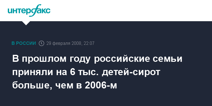 "Принятые меры материального и морального стимулирования как на федеральном уровне, так и на уровне субъектов, обусловили рост количества детей, переданных на семейные формы устройства в 2007 году, по сравнению с 2006, на 6,4%, на фоне ежегодного сокращения численности детского населения - на 3%", - сказала на коллегии директор департамента воспитания, дополнительного образования и социальной защиты детей Алина Левитская.