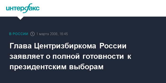 Москва. 1 марта. ИНТЕРФАКС - Председатель ЦИК Владимир Чуров заявил, что к проведению президентских выборов обеспечена полная готовность.