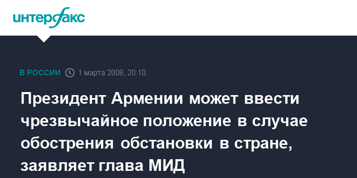 Ереван. 1 марта. ИНТЕРФАКС - Министр иностранных дел Армении Вардан Осканян не исключает, что действующий президент Роберт Кочарян может ввести в стране чрезвычайное положение, если с оппозицией не удастся договориться политическими средствами.