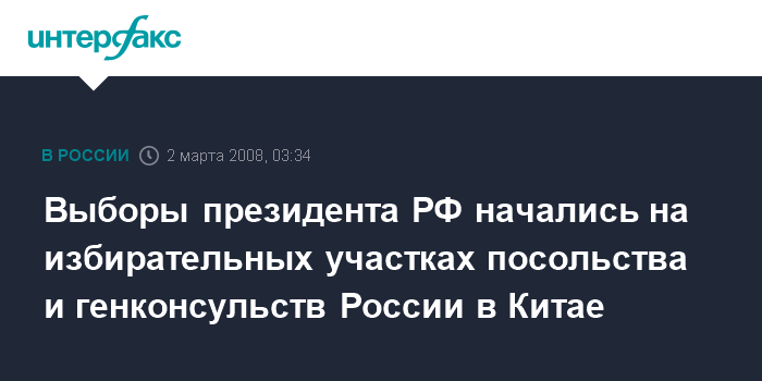 Пекин. 2 марта. ИНТЕРФАКС-КИТАЙ - Выборы президента Российской Федерации начались в торжественной обстановке на избирательном участке N 5139 в посольстве РФ в КНР в Пекине.