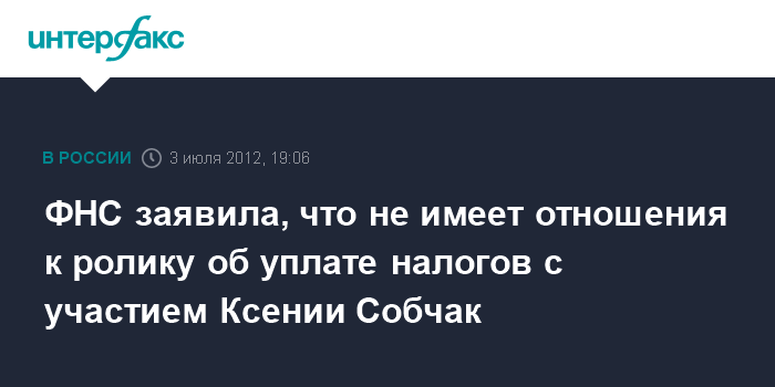 Москва. 3 июля. INTERFAX.RU - Федеральная налоговая служба (ФНС) не имеет отношения к созданию и распространению ролика "Заплати налоги и спи спокойно - 2012" с использованием образа Ксении Собчак, заявила пресс-служба ФНС.