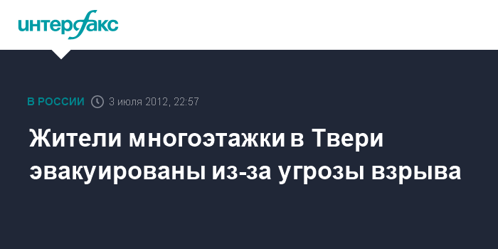 Тверь. 3 июля. INTERFAX.RU - Жители многоэтажного дома в Заволжском районе Твери были эвакуированы вечером во вторник из-за возможной угрозы взрыва, сообщили "Интерфаксу" очевидцы событий.