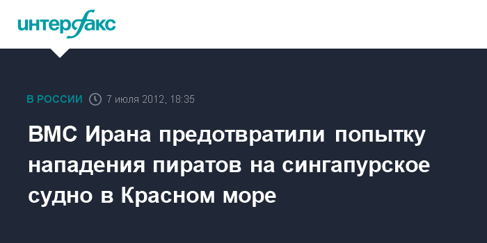 Тегеран. 7 июля. INTERFAX.RU - Корабли ВМС Ирана не позволили сомалийским пиратам захватить торговое судно под флагом Сингапура в Красном море, сообщают в субботу иранские СМИ. По их информации, два пиратских скоростных катера преследовали судно на выходе из Баб-эль-Мандебского пролива между юго-западной оконечностью Аравийского полуострова и Африкой. Экипажи иранских кораблей заметили преследователей и приблизились к ним. После ожесточенной перестрелки пираты ретировались. Сведения о жертвах не поступали.