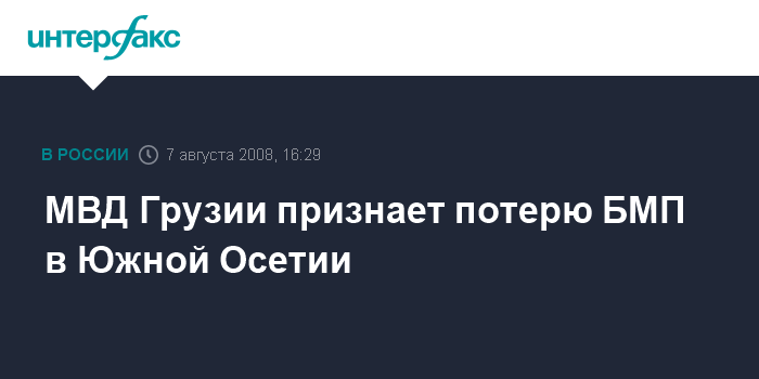 Москва. 7 августа. INTERFAX.RU - Пресс-центр МВД Грузии подтвердил факт попадания ракеты в БМП грузинских военных.