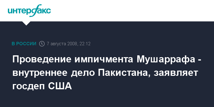Проведение импичмента Мушаррафа - внутреннее дело Пакистана, заявляет госдеп США
