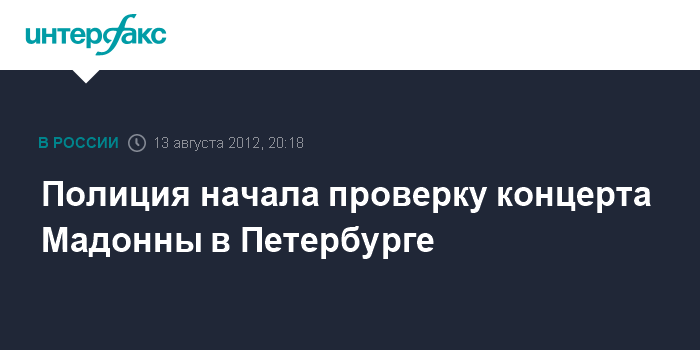 Санкт-Петербург. 13 августа. INTERFAX>RU - Полиция Петербурга приступила к проверке возможного нарушения закона о пропаганде гомосексуализма на концерте Мадонны 9 августа, сообщили "Интерфаксу" в понедельник в главном управлении МВД по северной столице.