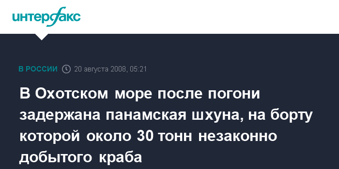 Петропавловск-Камчатский. 20 августа. ИНТЕРФАКС-ДАЛЬНИЙ ВОСТОК - Камчатские пограничники за незаконный лов краба в Охотском море задержали шхуну "Аделаид", шедшую под флагом Панамы.