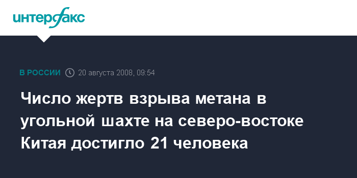 Москва. 20 августа. INTERFAX.RU - Число горняков, погибших в результате взрыва метана в угольной шахте в северо-восточной китайской провинции Ляонин достигло 21 человека, еще четыре человека числятся пропавшими без вести, сообщили местные власти.