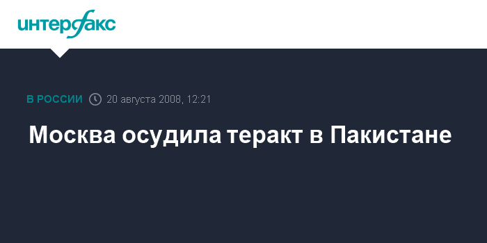 Москва. 20 августа. INTERFAX.RU - Россия решительно осуждает теракт, совершенный накануне в Пакистане, в результате которого погибли 32 человека и 55 получили ранения.