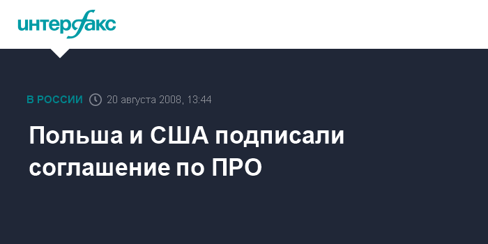 Москва. 20 августа. INTERFAX.RU - Польша и США в среду подписали соглашение о размещении элементов американской противоракетной обороны на территории Польши.