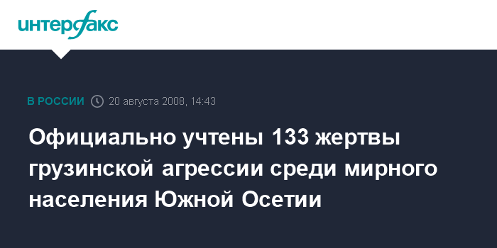 Москва. 20 августа. INTERFAX.RU - По официальным данным, 133 человека среди гражданского населения Южной Осетии признаны жертвами грузинской агрессии, но многие захоронения еще не учтены, заявили в следственном комитете при прокуратуре РФ.