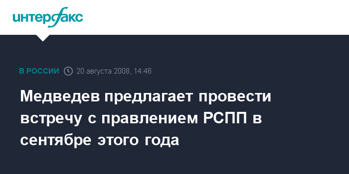 Москва. 20 августа. INTERFAX.RU - Президент России Дмитрий Медведев намерен встретиться с правлением РСПП в сентябре этого года.