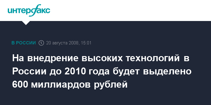 На внедрение высоких технологий в России до 2010 года будет выделено 600 миллиардов рублей