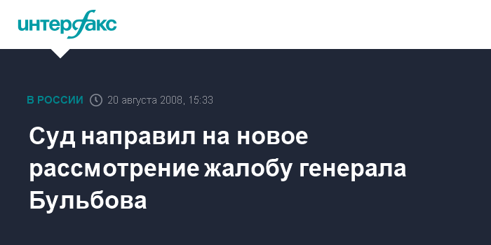 Москва. 20 августа. INTERFAX.RU - Мосгорсуд направил на новое рассмотрение жалобу генерала Госнаркоконтроля Александра Бульбова, обвиняемого в незаконной прослушке телефонных разговоров, на отказ Следственного комитета при прокуратуре (СКП) РФ рассмотреть его просьбу о возбуждении уголовного дела по факту давления, которое, по мнению А.Бульбова, оказывалось на бухгалтера ЧОП "Немезида" Елену Мардашову.