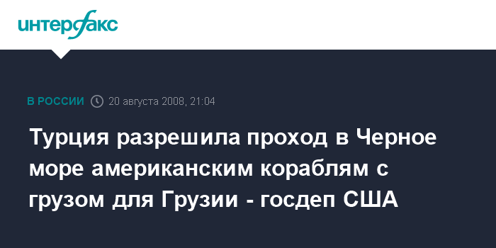 "Турция одобрила проход в Черное море трех кораблей США, которые доставят гуманитарную помощь в Грузию, - сообщил представитель госдепа США Роберт Вуд. - Речь идет о двух кораблях и одном катере береговой охраны".